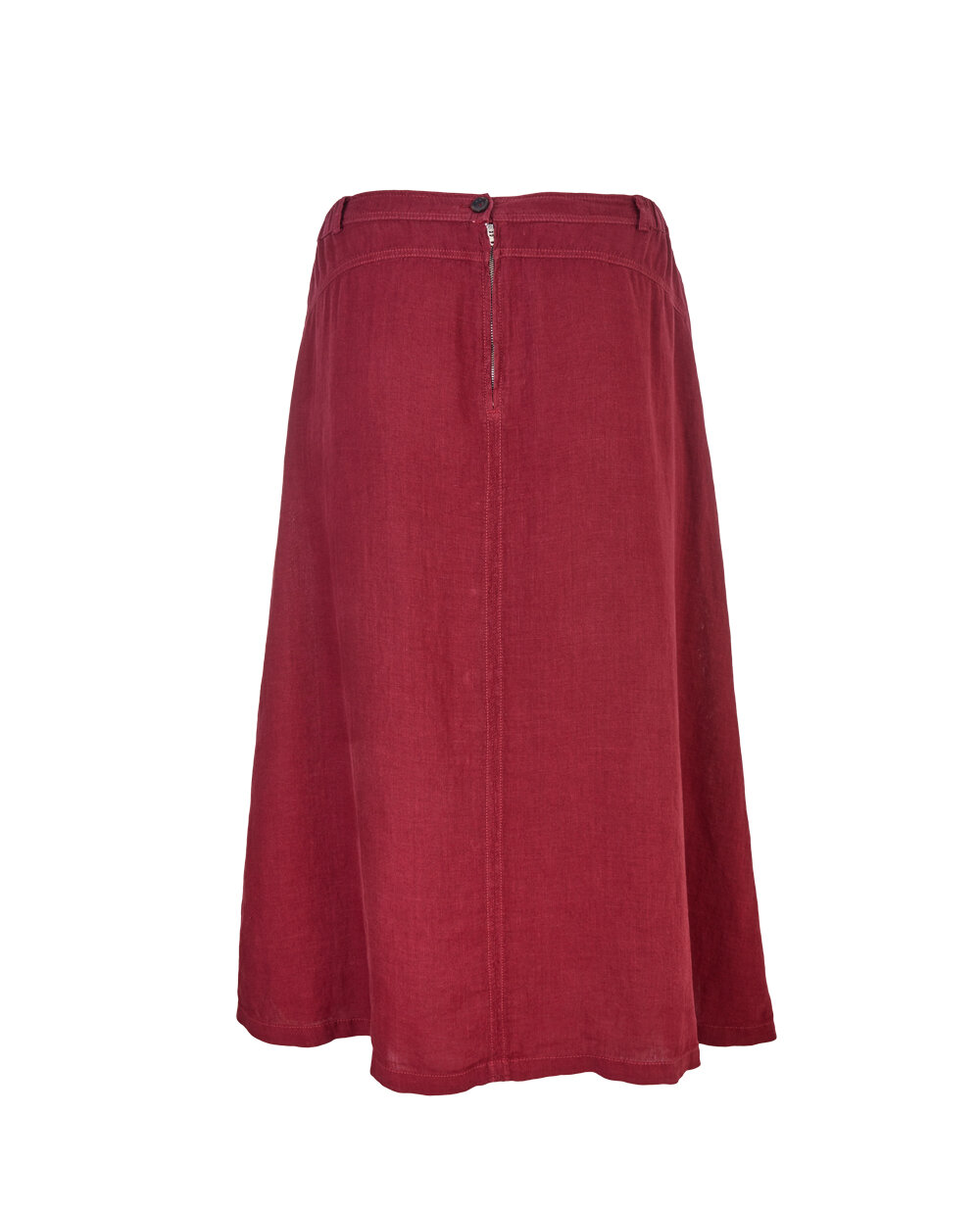 Спідниця Elena Miro з 100% льону бордового кольору. Модель подовженого, розширеного до низу силуету. Застібка ззаду на блискавку і ґудзик. Спереду спідниця по всій довжині декорована планкою з ґудзиками. З боків косі кишені. Довжина виробу в 41 розмірі 67 см.
