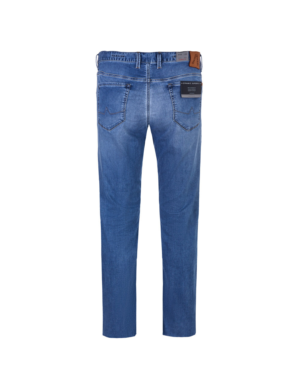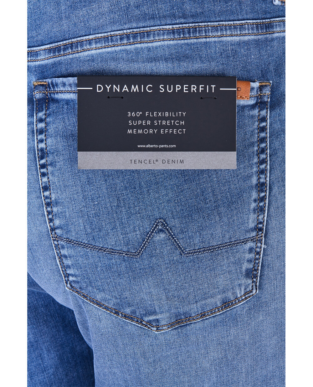 Чоловічі джинси Alberto серія Dynamic Superfit з дуже еластичної тканини класичного синього кольору. Застібка на металеву блискавку і ґудзик, еластичний пояс з шлевками для ременя. Модель з п'ятьма кишенями: спереду косі прорізні, ззаду - дві накладні. Фірмова фурнітура. Тканина з охолоджуючим ефектом і ефектом пам'яті, що не дозволяє джинсам втрачати форму і розтягуватися.