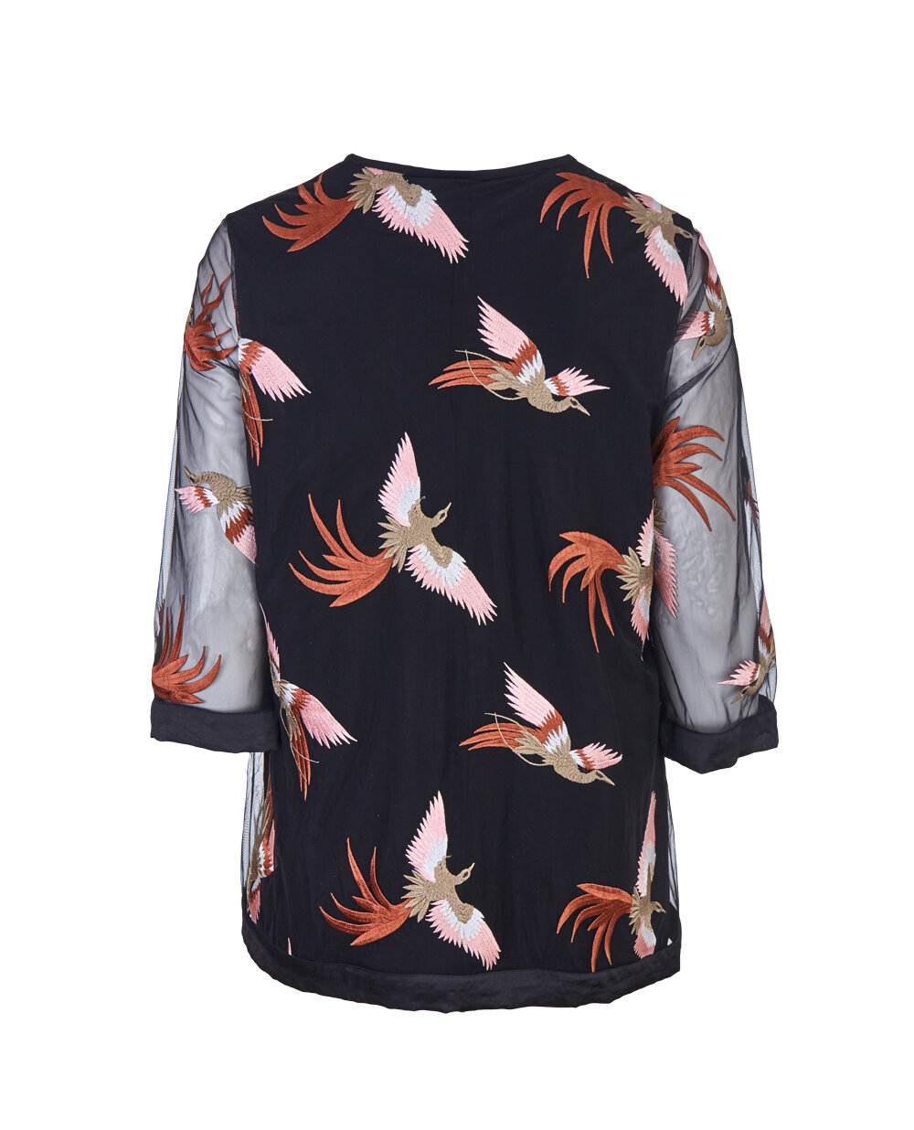 Подовжена туніка вільного крою, виконана з різних фактур тканини: нижня частина - тонкий трикотаж чорного кольору, верхня - сітчаста тканина з оригінальним принтом. V-подібний виріз горловини, напівпрозорі рукави 3/4. Низ виробу і манжети рукавів декоровані атласною тканиною. Довжина туніки в 48 розмірі 82 см