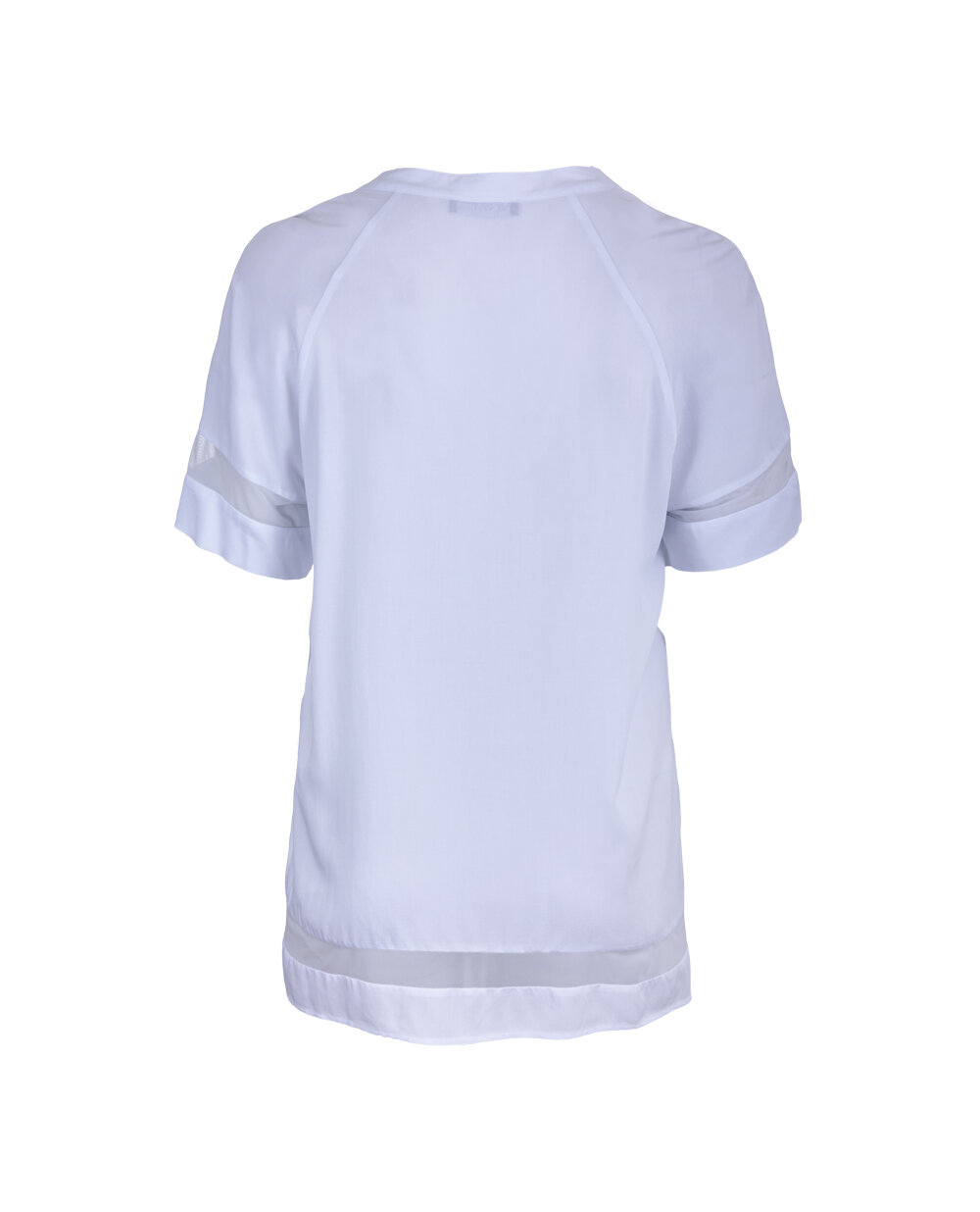 Блуза білого кольору з V-подібним вирізом, рукав і нижня частина блузи окантовані вставками з сітки. Довжина в розмірі 44 - 77 см