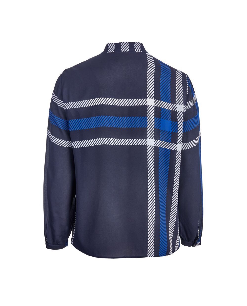 Класична блуза темно-синього кольору з контрастним геометричним принтом з легкої віскози. Модель повністю застібається на ґудзики. Ворітник-стійка декорований стрічками, які можна зав'язати в оригінальний бант. Довгий втачний рукав з манжетом на ґудзику. Довжина в 49 розмірі 80 см.