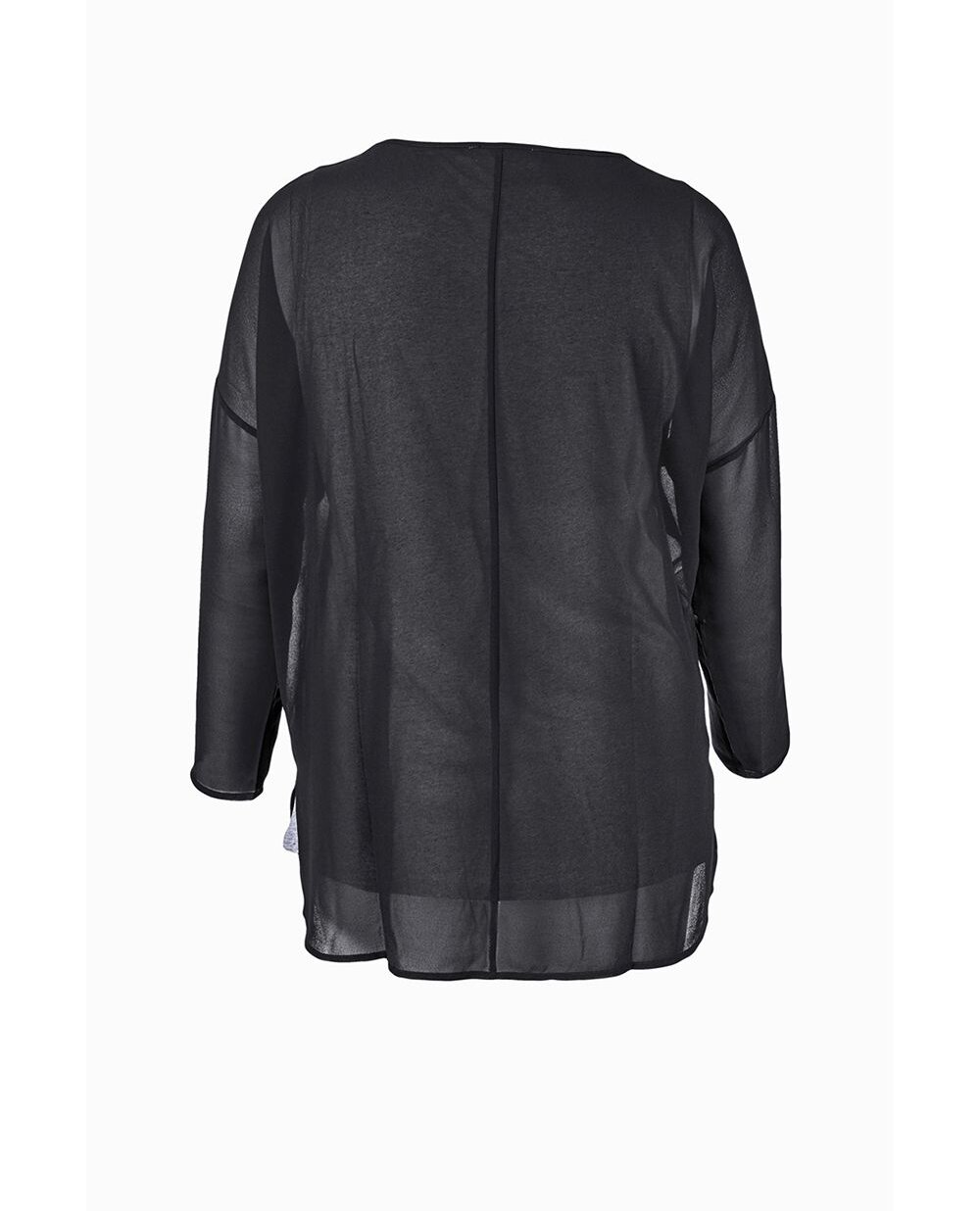 Джемпер виконаний з двох тканин з накладенням. Нижня частина кольору акуляча шкіра з високоякісного матеріалу, верхня частина з чорного креп-жоржета. Припущений рукав, прямий силует, круглий виріз горловини.