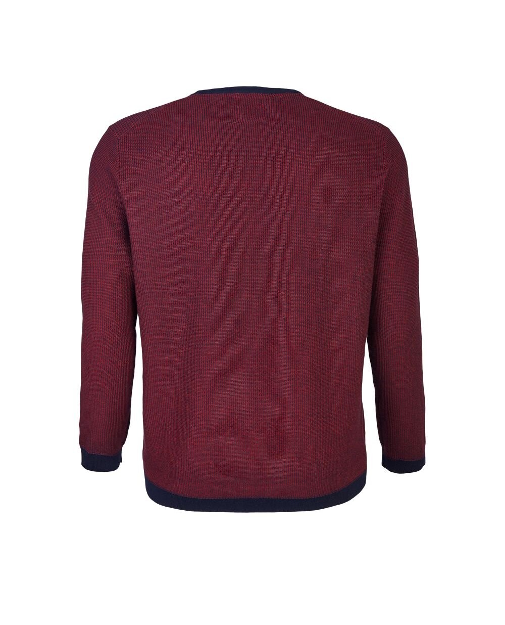 Джемпер з фактурного трикотажу з додаванням вовни бордового кольору. Модель в стилі Casual вільного крою. Круглий виріз горловини, довгий рукав. Рукава, низ виробу і горловина оброблені гумкою контрастного темно-синього кольору. Трикотаж середньої щільності, м'який.