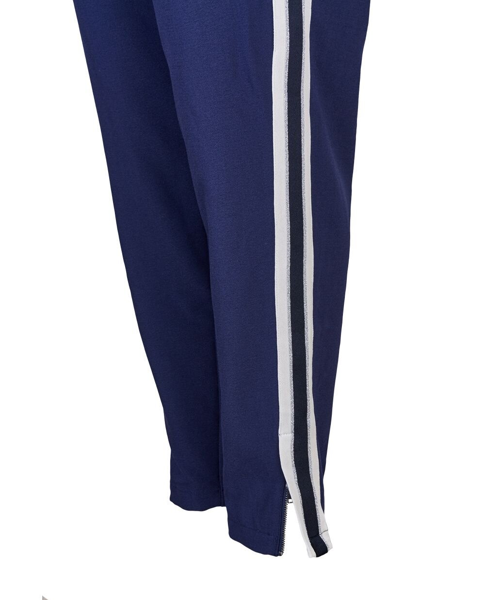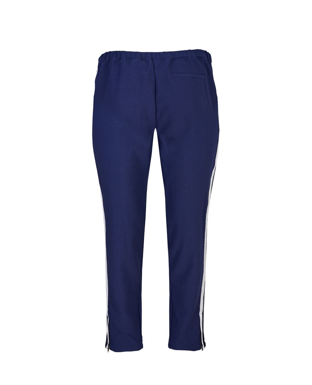 Штани з струмливої тканини середньої щільності. Модель синього кольору злегка завужена до низу, з боків лампаси контрастного кольору. Внизу штанини, по бічних швах застібки-блискавки. Пояс на еластичній гумці і кулісці. Дві прорізні кишені.