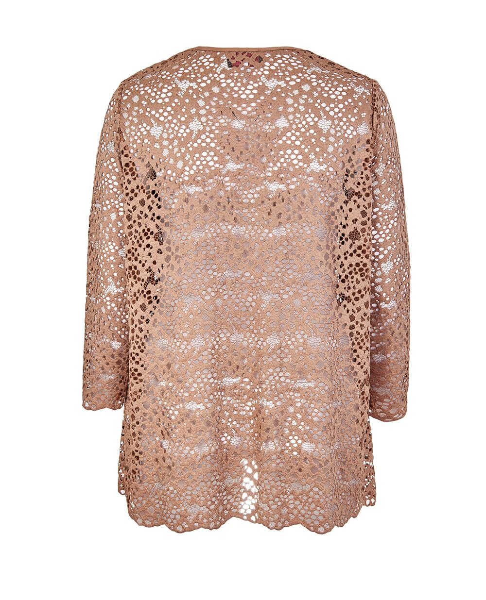Подовжена мереживна накидка без застібки. Модель виконана в приємному однотонному кольорі, рукав довгий, ажурний візерунок підкреслює оригінальність накидки. Лаконічність крою і відмінна посадка виробу робить модель комфортною.