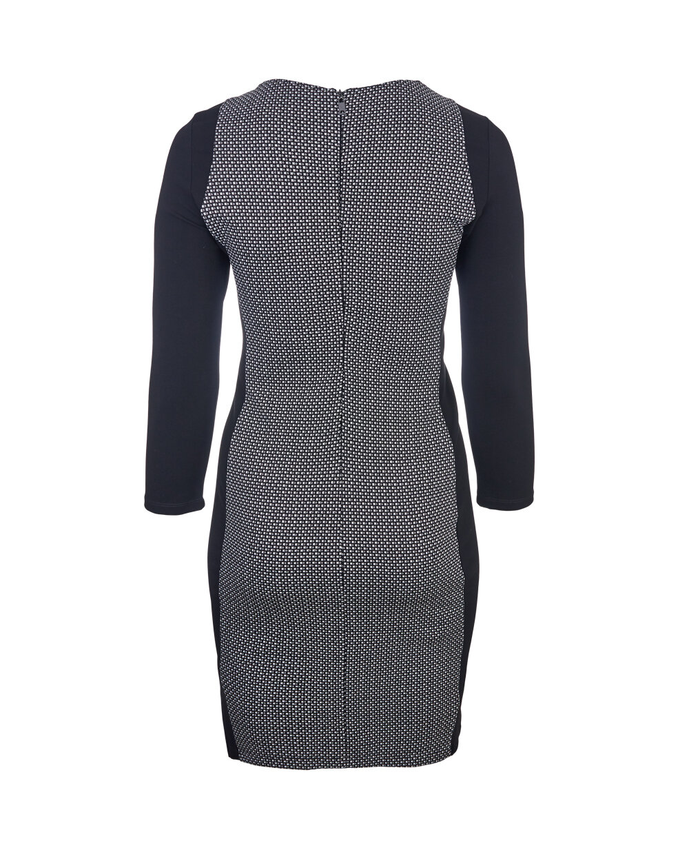 Сукня-футляр з тканини Punto Milano з чорно-білими вставками спереду і ззаду. На спинці блискавка-застібка і круглий виріз горловини. Довгі рукави і виточки по лінії грудей.