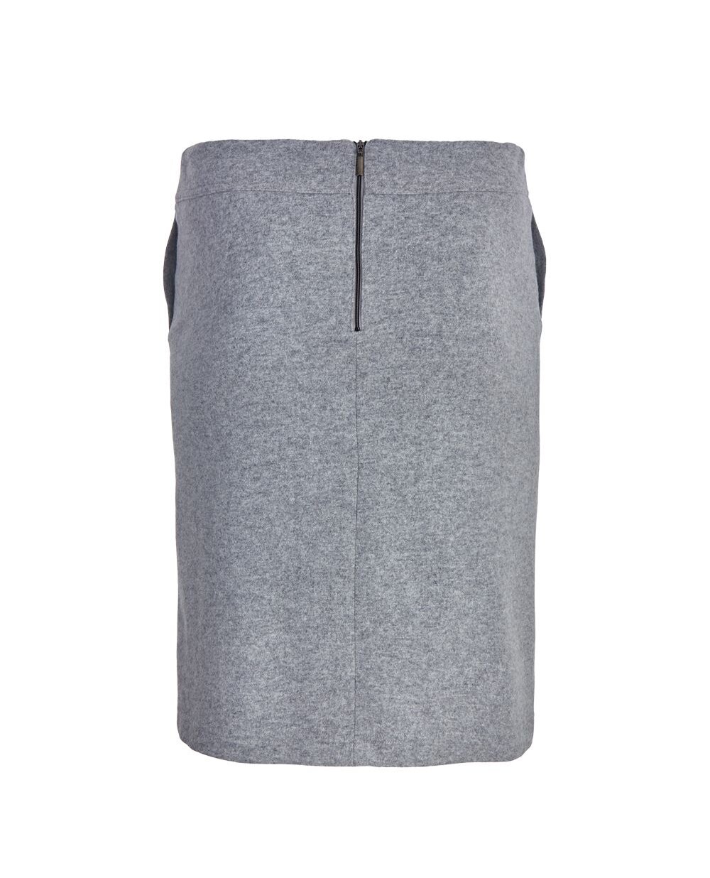 Спідниця Eugen Klein сірого кольору з трикотажної набивної вовни. Модель пряма, на підкладці, широкий пояс-кокетка, з боків вертикальні кишені оброблені в рамку.