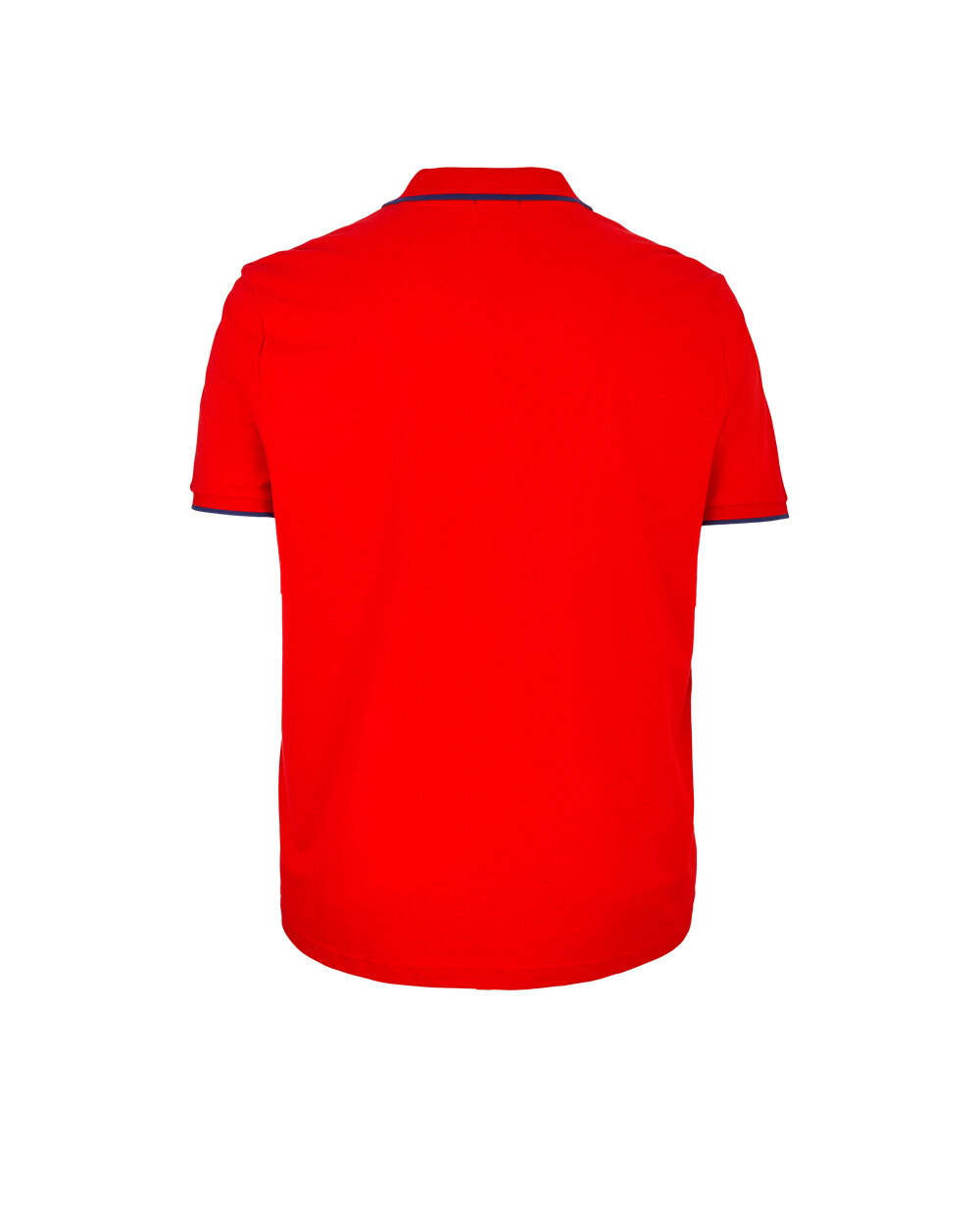 Поло з високоякісної 100% бавовни червоного кольору. Горловина з відкладним коміром, застібка на три ґудзики. Низ рукава оброблений гумкою. Комір, манжети рукава і планка застібки декоровані контрастною смугою синього кольору.