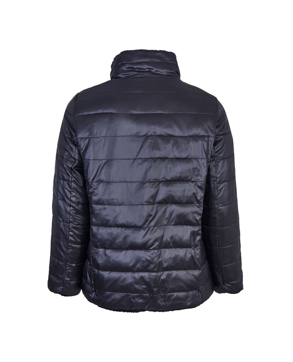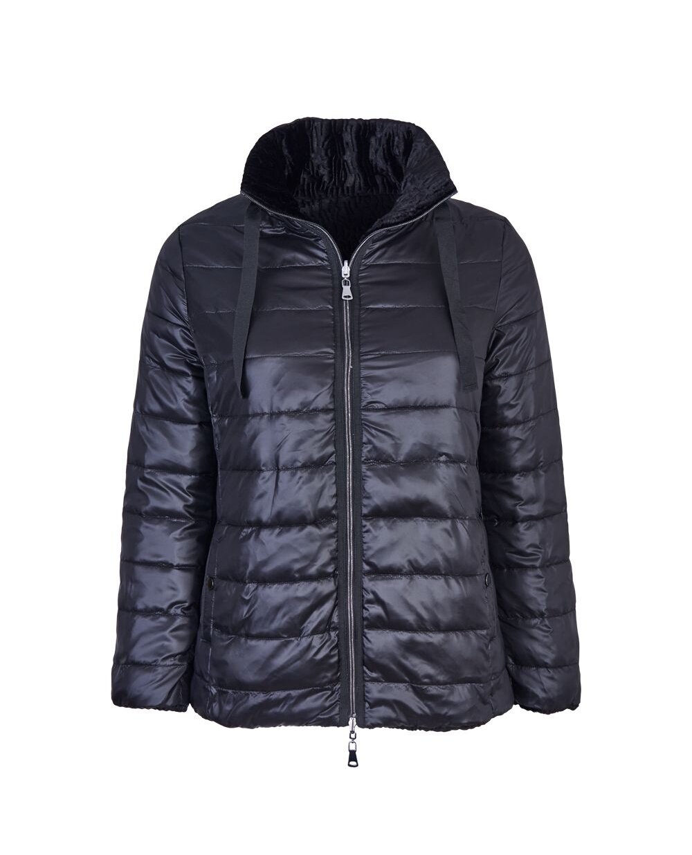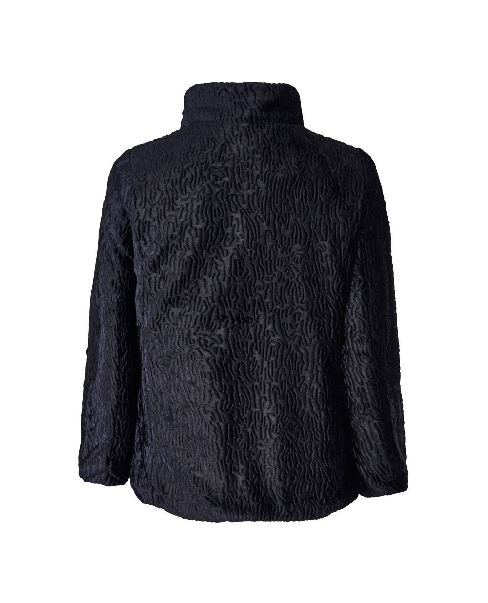 Шуба двостороння прямого крою. Довгий рукав, комір стійка, застібається на металеву блискавку. Одна сторона чорного кольору з імітацією хутра під каракуль, дві бічні кишені на блискавці. Друга сторона - однотонного чорного кольору, дві бічні кишені на кнопках. Довжина виробу в 46 розмірі 74 см.