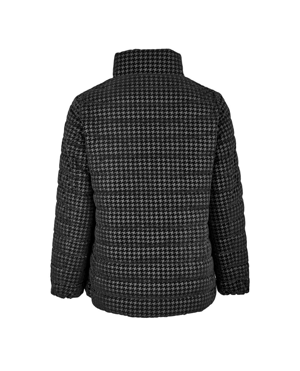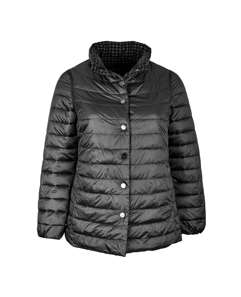 Двостороння куртка трапецієподібної форми з колекції Elena Miro. Одна сторона куртки однотонна чорного кольору, інша - принт гусяча лапка з напиленням з оксамиту. Особливості моделі: комір стійкий, застібка на кнопки, кишені на блискавці, рукав внизу на гумці. Довжина в 45 розмірі 73 см.