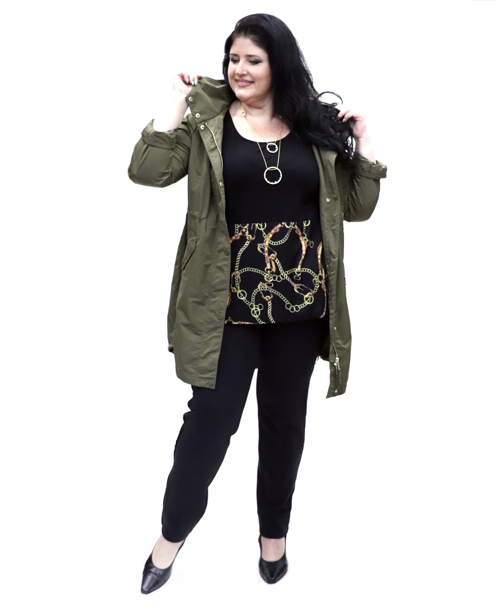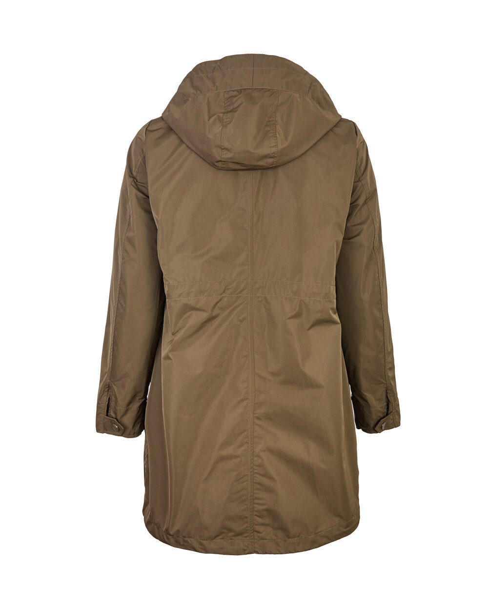 Вітровка-парка без підкладки з колекції Elena Miro. Модель прямого, подовженого крою з капюшоном на кулісці по краю. Застібка на блискавку і кнопки. Ворітник стійкий, довгий прямий рукав із застібкою на кнопку, капюшон не відстібається. Спереду 2 косі кишені з клапаном на кнопці. Усередині в області пояса прихована куліска. Довжина по спинці в 43 розмірі 90 см.