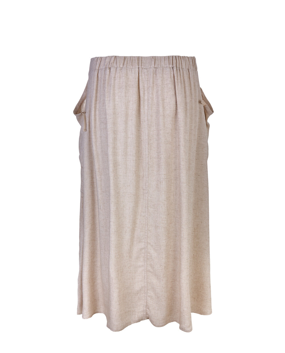 Подовжена спідниця А-силуету. Пояс без застібки, ззаду на резинці. Зліва спереду вертикальна куліска, що утворює драпірування, великі накладні кишені, краї яких, декоровані куліскою. Довжина спідниці в розмірі 3XL - 92 см, об'єм по поясу (без розтягування) - 99 см.