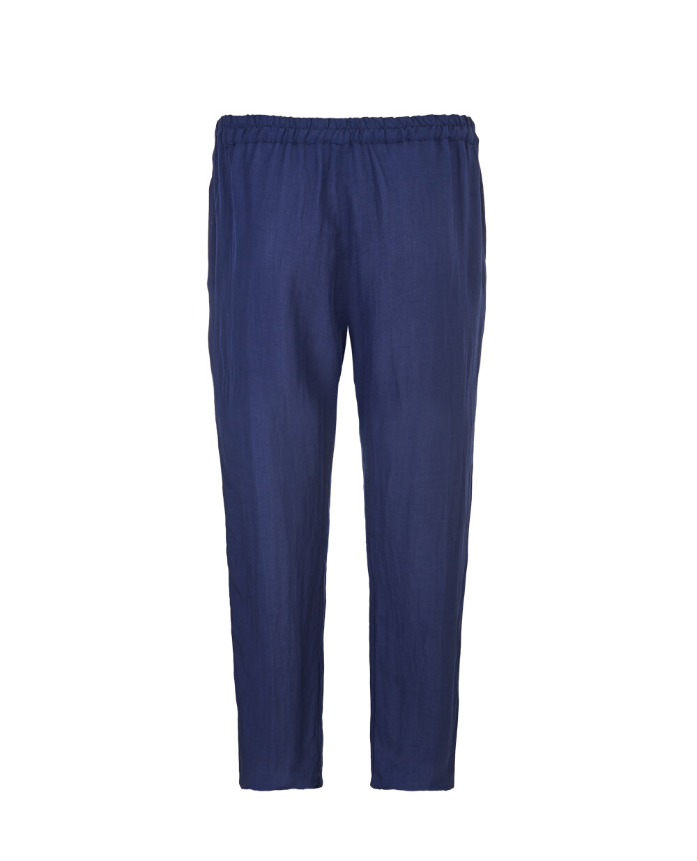 Штани темно-синього кольору з струмливої віскози з додаванням льону. Модель прямого крою з високою посадкою. Пояс на еластичній резинці із застібкою на блискавку і ґудзик. З боків прорізні кишені.