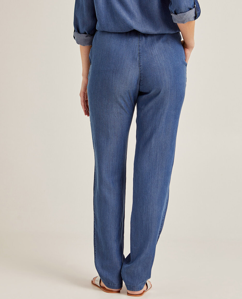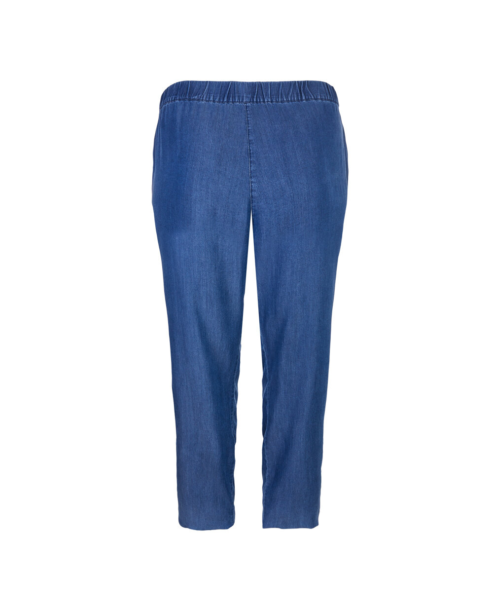 Прямі брюки Elena Miro синього кольору з тонкого ліоцелу. Особливості моделі: висока посадка, пояс на еластичній резинці з куліскою, застібка на блискавку і ґудзик. З боків косі прорізні кишені.