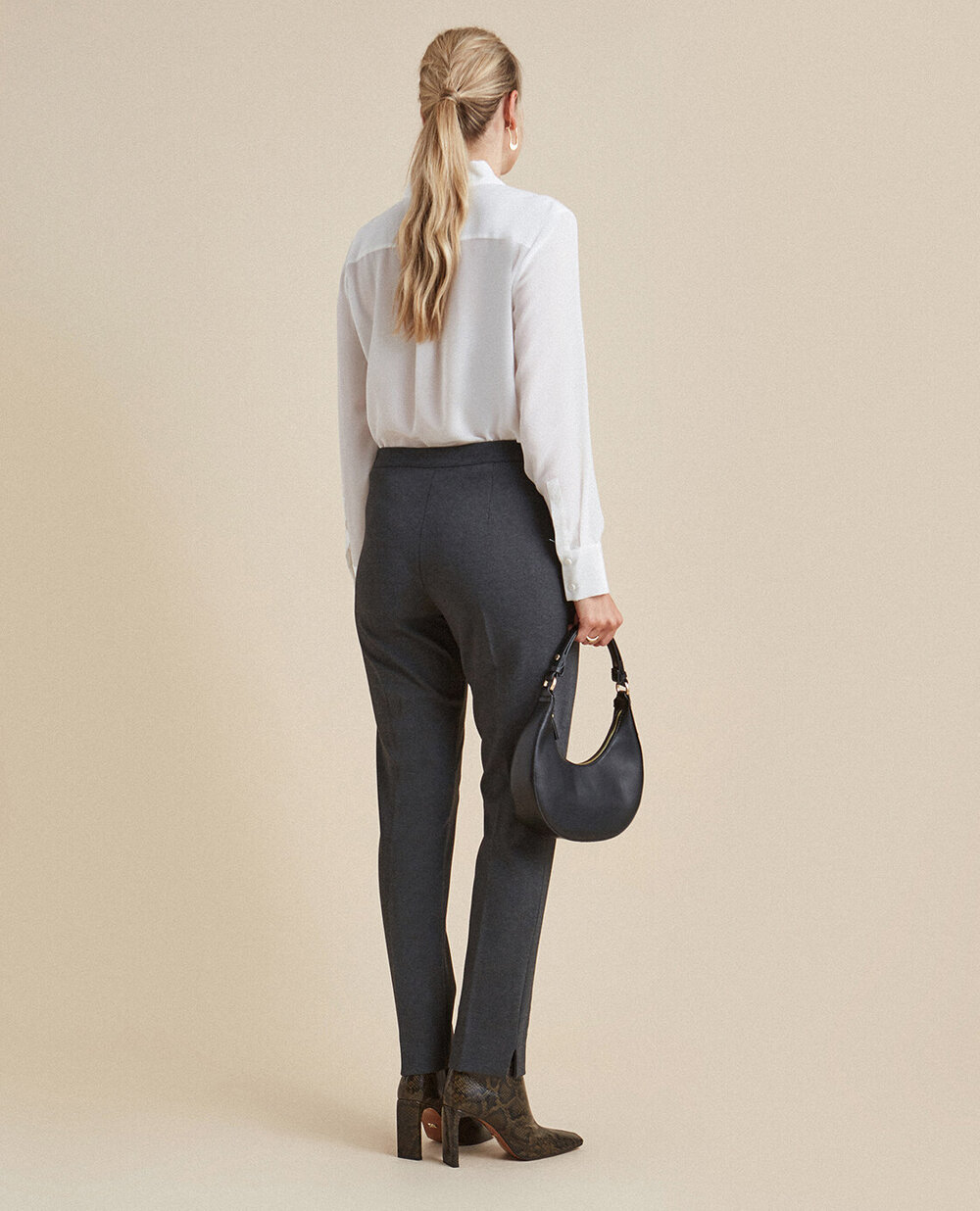 Брюки трикотажні з високою посадкою. Модель завужена до низу, знизу з боків розрізи, ззаду модель з виточками. Довжина в розмірі 45 - 106 см, напівобхват стегон 69 см, напівобхват талії 52 см