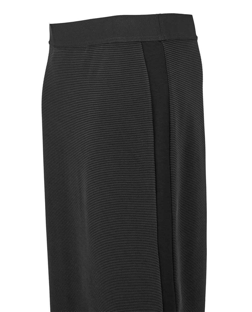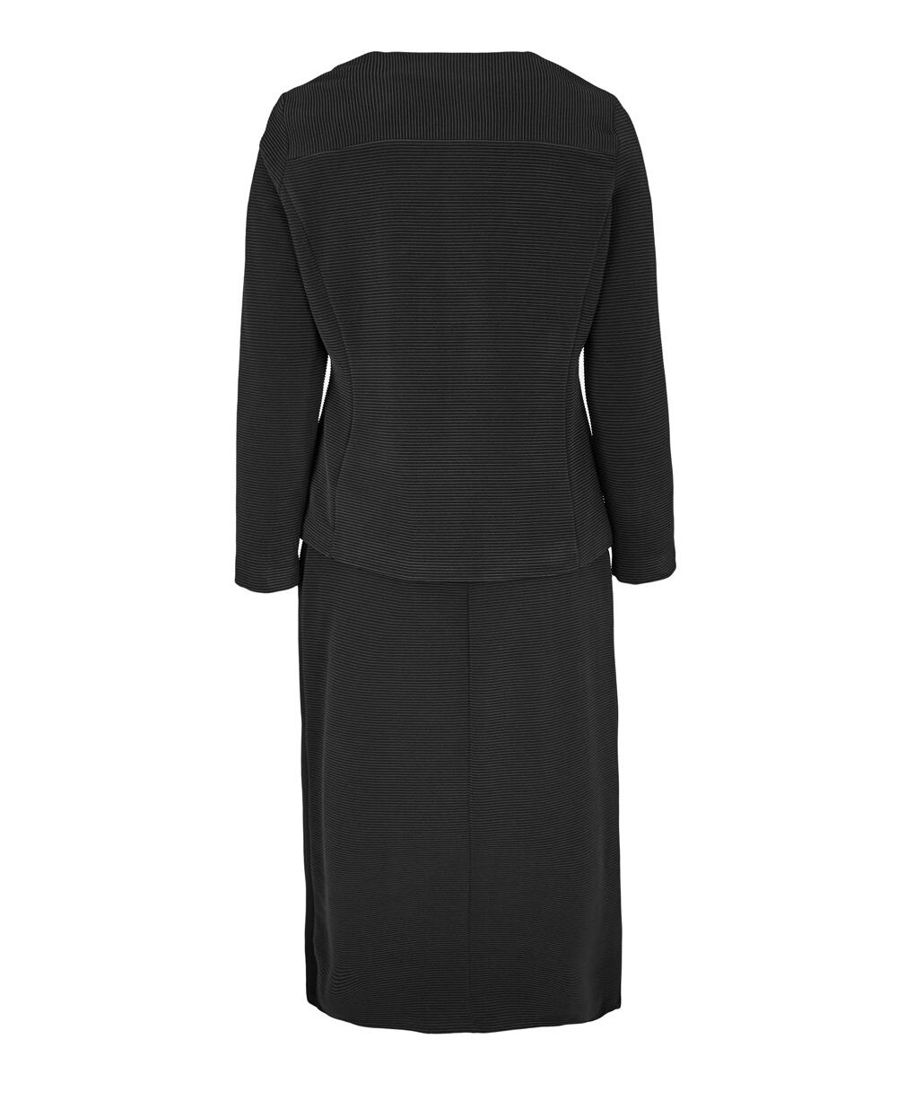 Елегантний спідничний костюм Elena Miro чорного кольору з фактурної тканини, складається з жакета і спідниці. Жакет на підкладці, застібка на металеву блискавку, круглий виріз горловини. Спереду дві прорізні кишені. Довжина жакета 66 см в 44 розмірі. Спідниця довжини міді, пояс на широкій гумці. З боків лампаси з гладкого трикотажу. Спідниця без підкладки. Довжина виробу 76 см в 44 розмірі.