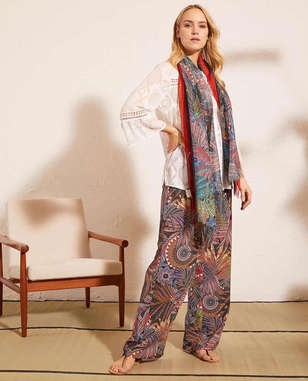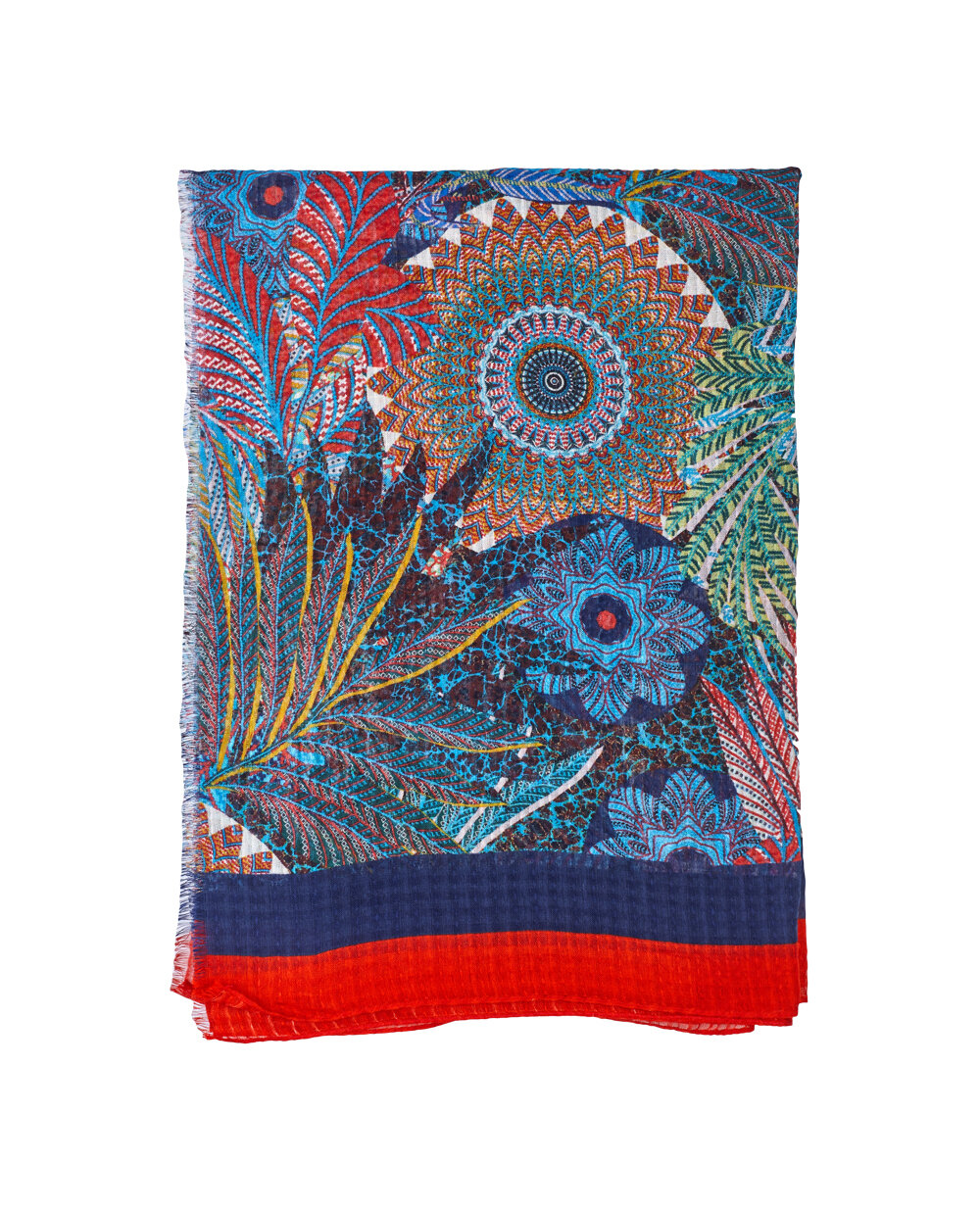 Шаль з високоякісної тонкої, м'якої тканини, до складу якої входить бавовна і віскоза. Квітковий принт з червоно-синіми смугами по краях. Контур основи доповнений короткою бахромою. Розмір 86см * 180см.