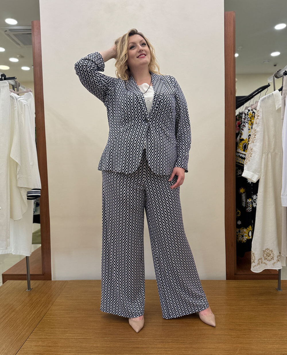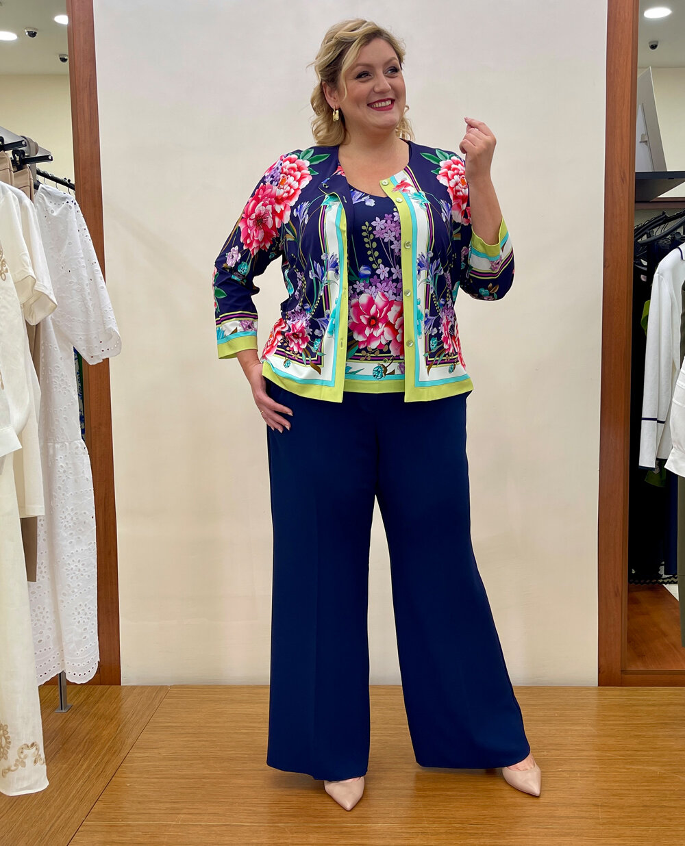 Street-style-фотографії моделей жіночих жакетів для повних дам надихають модниць на сміливі поєднання з джинсами або широкими брюками-палаццо. Топ із квітковим принтом або лаконічна шовкова блуза стануть ідеальним завершенням комплекту.
