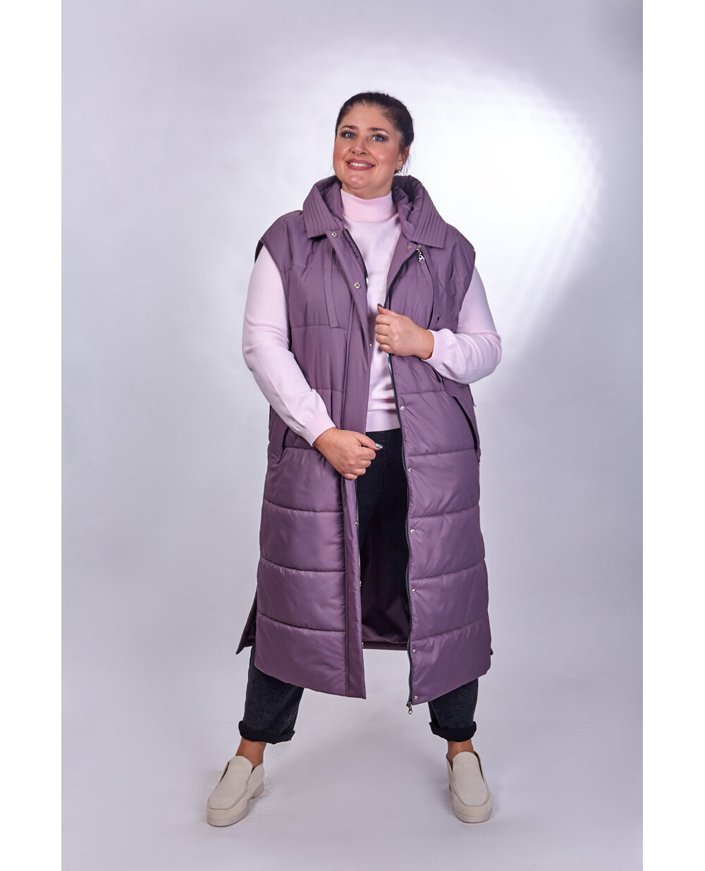 Власницям пишних форм варто обирати моделі подовженого крою, адже вони приховують об’ємні стегна. Якщо у вас достатньо стрункі ноги, можна обрати безрукавку класичної довжини. Головне, щоб вона прикривала поперек і захищала від негоди.